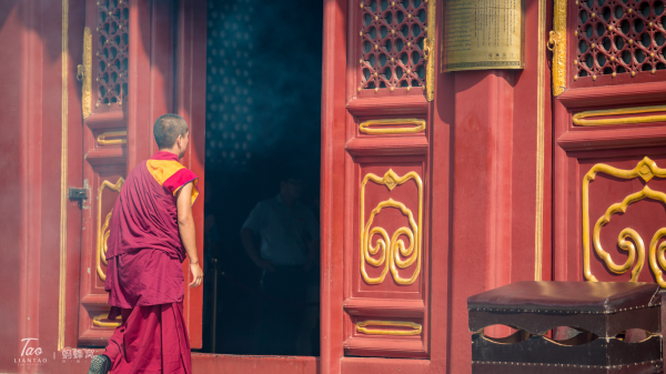 大殿中有僧人正在进行早课,门外和殿内四周围绕着游人,有僧人不时走神,目光从经书移向门外。