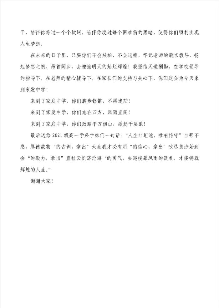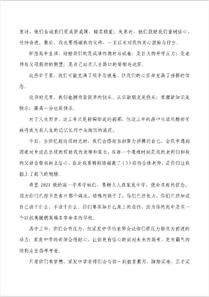 高中三年,一千多个日日夜夜的埋头苦读、拼搏奋进的时光在这里定格。理想和信念在这里交融,梦想与情感在这里汇合。匆匆三年,我们有过悲伤有过快乐,有过失败有过成功。我们经过高中三年的洗礼,终于脱去少年的青涩,变得自信而成熟。三年刻苦的学习,赋予我们智慧与力量;三年成长的历程,赋予我们深厚的师生情谊、真诚的同窗友谊。“此去须怀报国志,不忘春风化雨情”!谢谢所有爱我们的人,我会珍惜所有的感动,把每一份希望都握在手里。我永远是2021届家发中学的学子,我会一直微笑着前行.....