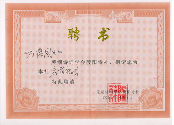 热烈祝贺我校万校长荣获陵阳诗社名誉社长