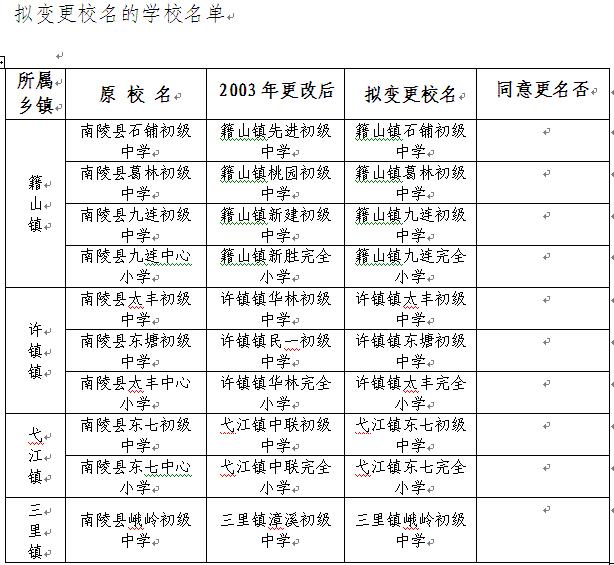 根据中国人民政治协商会议南陵县第九届委员会第四次会议第106号提案《关于对我县部分中小学校名进行更改的提案》的要求,按照学校更名的工作程序和有关规定,县教育局组织提案中建议变更校名的13所学校,广泛征求民意,召开听证会,征求所辖镇党委政府和当地村民委员意见。在认真调研,广泛征求民意的基础上,同意对10所学校(3所小学、7所初中)的校名进行变更,另3所学校校名维持不变。
