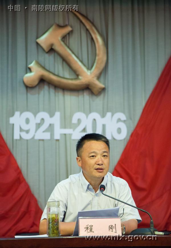 程刚代表中共南陵县委向奋战在全县各条战线上的2万4千余名共产党员致以节日问候,向受表彰的先进基层党组织、优秀共产党员和优秀党务工作者表示祝贺。程刚全面回顾了95年来我党领导全国各族人民取得的辉煌成就。他说,伴随我们党95年的前进步伐,南陵的发展也走过了不平凡的历程。特别是近年来,在芜湖市委的坚强领导下,县委统揽全局,团结带领全县人民,凝心聚力干事创业,务实奋进加快发展,奠定了较为坚实的产业基础,打破了对外交通的瓶颈制约,城乡面貌焕然一新,广大群众安居乐业,党员干部引领发展的能力全面提升。在近日的防汛抢险中,我们的党员不畏险情,不怕牺牲,勇于担当,无私奉献,筑起了一座座冲不垮的堡垒,竖起了一面面鲜红的党旗,确保全县人民生命财产安全。