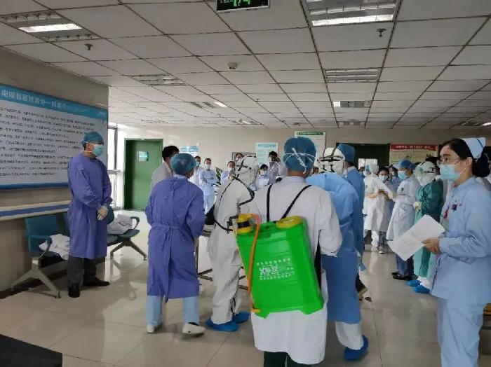 演练模拟了一位患者因急性上腹部疼痛入院,经预检分诊询问流行病史得知此患者来自重点疫情地区。医院立即启动新冠肺炎防控应急预案,根据工作流程,将患者转到发热门诊,经外科医生会诊,需要急症手术。沿专用通道转移患者入过渡手术间手术,术后转到外一科过渡病房,取样做核酸检测。随后,医务人员对手术间、电梯等处进行了消杀处置工作。