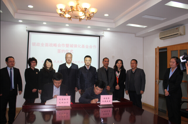 11月10日,南陵县人民政府和徽商银行芜湖分行举行银政全面战略合作暨城镇化基金合作签约仪式。县委书记程刚,县领导阙方俊、杨利民,徽商银行芜湖分行行长倪见祥,副行长程志坚等参加签约仪式。