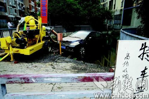 楚天金报讯 图为:渍水未退,收购泡水车广告贴到风华天城车库出口
