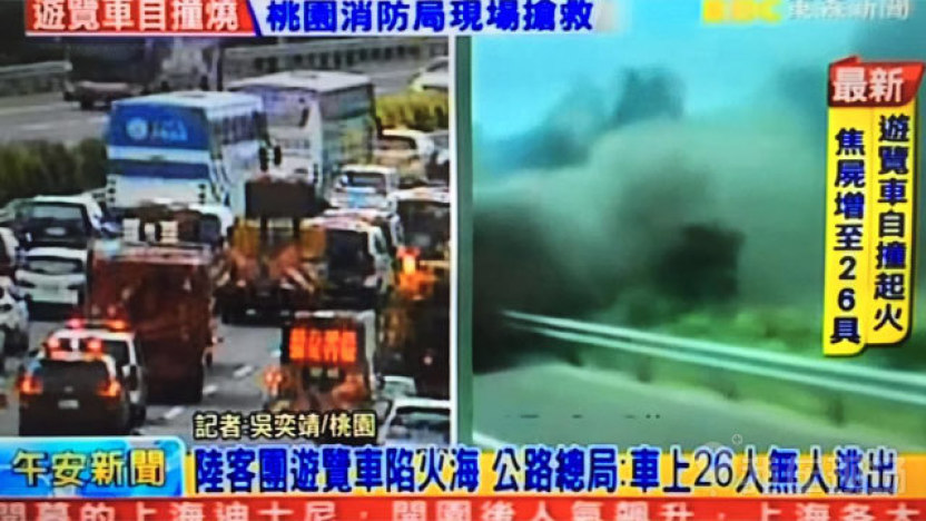 今天中午12时57分,台湾桃园机场联络道发生自撞车祸,整辆车起火燃烧。26人全部罹难,其中24名游客来自辽宁。该团为博达旅行社所接来自辽宁省的大陆团,团员8男16女。另有领队和司机。12日来台,原计划今天回去。
