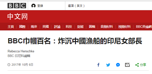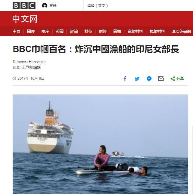 最后,值得一提的是,其实BBC的英文版网站并没有露骨地写明他们选择苏西是因为她“敢炸中国渔船”,其原标题是“她敢为了打击违法捕鱼而炸沉渔船”。
