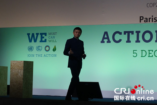 12月5日,阿里巴巴集团董事局主席马云受邀在联合国气候变化巴黎大会上发表主题演讲。