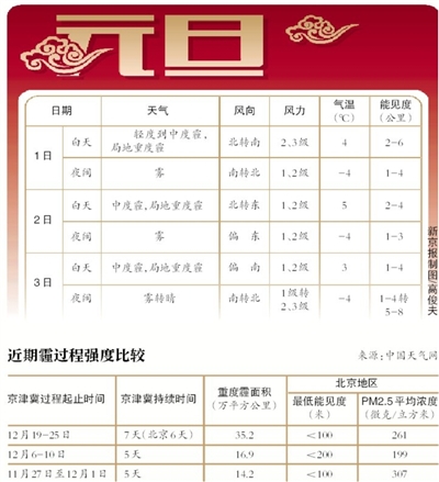 其中,31日夜间至明年1月3日,北京、天津、河北中南部、山东中西部、河南中北部等地有中度霾,局地重度霾,并伴有重度污染,局地严重污染;3日,北京、天津、河北南部霾天气有所缓解。