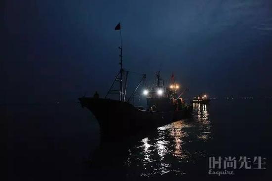 船接着以后,好几天时间一直往上面搬物资,鱼肉米面什么都是公司给,还有那些蔬菜。再就是装灯,钓鱿鱼得靠亮光吸引鱿鱼,船头这块有个杆,上面有个连接,一边一个,上面都挂着灯,一个两千瓦,飞利浦的,有这么粗吧,挂了十几个,人眼睛看时间长了受不了,都流眼泪。