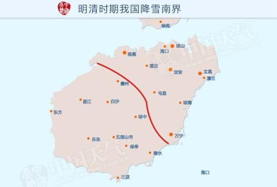 据记载,明清时期我国的最南雪线明显比现代偏南,海南的琼山在明朝万历、清朝康熙和光绪年间都出现过降雪。最近一次广东、广西和海南出现降雪的记载是在清朝光绪年间,在1893年前后的几年中,广东、广西沿海地区和海南的琼山都有降雪出现,距今已120余年历史。