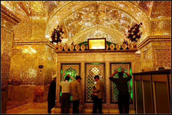 进入圣陵大殿时是男左女右分开的,男女各一半,中间有屏障隔开,而圣陵放置于男女之间,使男女都可以瞻仰朝拜,这是男方一侧的圣陵(绿色玻璃内),整个大殿镶满了无数的镜瓦,显得晶莹锡透。