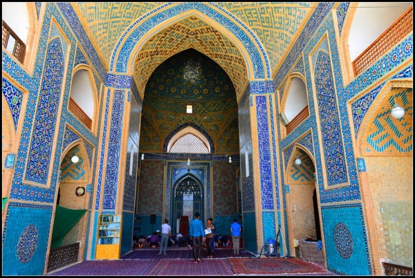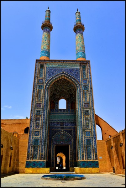 在伊朗的城乡,清真寺多得数不胜数,但几乎每个城市都有一座聚礼清真寺。这座亚兹德的聚礼清真寺入口两座镶嵌蓝色瓷砖,高达48米的光塔,其高度在伊朗是数一数二的。光塔(宣礼塔)最初的功能是是供宣礼员登高召唤信徒前来做礼拜用的,但从公元十世纪开始,光塔越建越高,其装饰作用远远大于实用性。现在清真寺的宣礼员再也不用爬高了,通常是播放录音来召唤信徒。大多数光塔的最高处都装有绿颜色的灯(伊斯兰教最喜爱的颜色),光塔及绿色灯光被视为引导人们前来祈祷的标志。