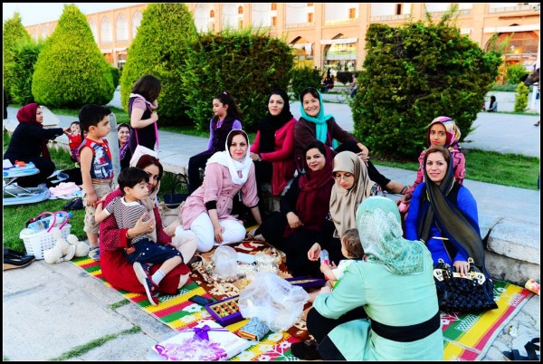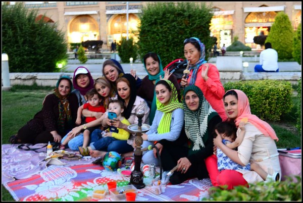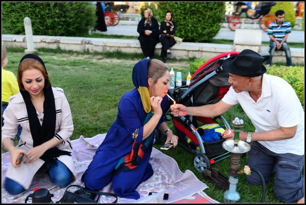 这一家妇女带着食品、饮料坐在铺在草坪上的毯子上面,惬意地抽着水烟聊天。在得知我们是“秦”后,十分热情地邀请我们加入她们的家庭聚会,当我们表示对她们所吸的水烟很感兴趣时,还特意为我们演示如何抽水烟,家里的妈妈特意猛吸了一口烟喷出来。