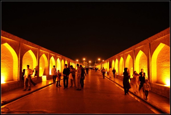 我们离开广场打出租车到达三十三孔桥,夜幕中灯光下的三十三孔桥非常漂亮。三十三孔桥桥面上外加一排拱门,看似双层拱桥,具有浓厚的伊斯兰建筑风格。扎扬德河的旱季可上下同行,而在雨季,河面漫过三十三孔桥石坝,只有上层才可以通行。
