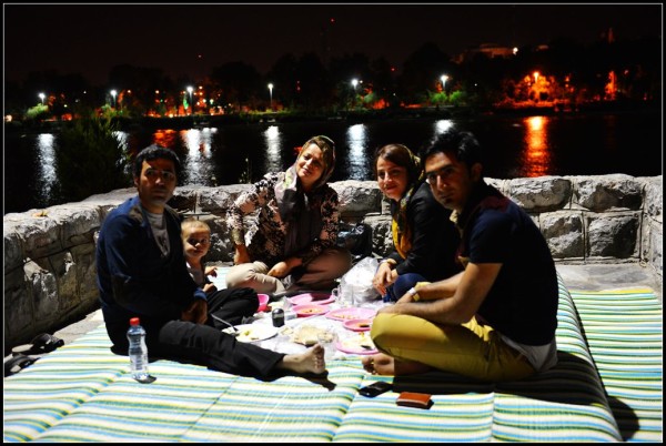 扎扬德河岸两边有许多这样在外晚餐的家庭,看来伊斯法罕的人们很懂得生活,也很讲究生活的情趣。我们路过时有好几个家庭都友好地邀请我们与他们一起共进晚餐,让我们感到作为中国人在伊朗太好了,太受到伊朗人的欢迎了。我们还真的在路边吃了一家人的晚餐,这家人做的西红柿炒鸡蛋配大饼很好吃,当然我们并不敢放开来吃,也只是尝了尝,但是这家人实在热情,一再请我们把剩下的都吃了,搞得我们真不好意思了。可惜当时光线太暗,拍的都虚了。