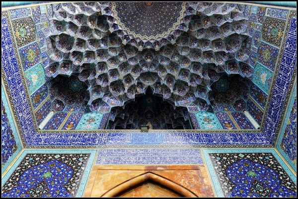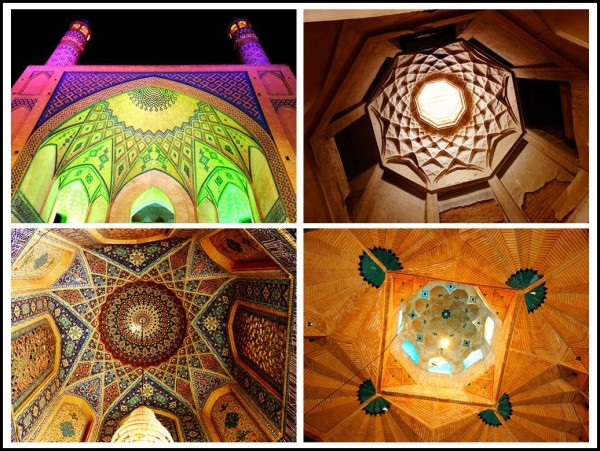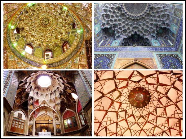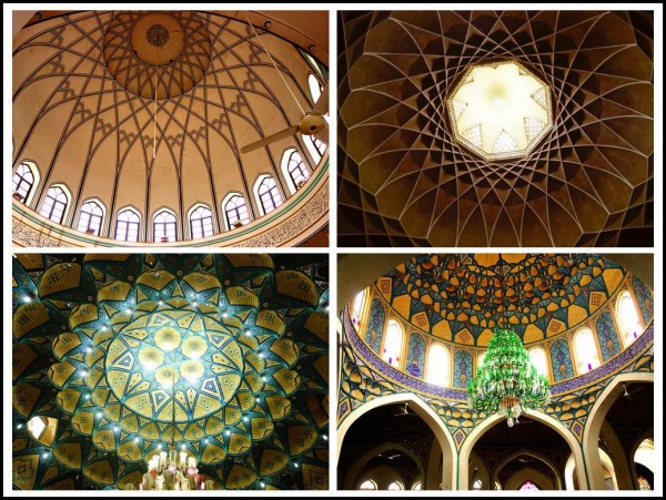 各种繁复精美的穹顶是波斯建筑最伟大的成就之一,公元200多年的萨桑王朝就已经率先出现了采用双层或对角斜拱的方法在四方形空间上建造穹顶的建筑技术,开始一般的是下层是八角形,上面的一层是十六边形,穹顶就这样架在上面,再往后来,穹顶的发展方向越来越复杂,外面锥形、甚至是洋葱形状的大穹顶还要套上一个半圆形的小穹顶,通常穹顶外面贴有瓷砖,其图案繁复之极,从而成为波斯建筑的标志。