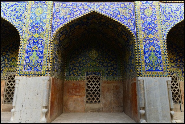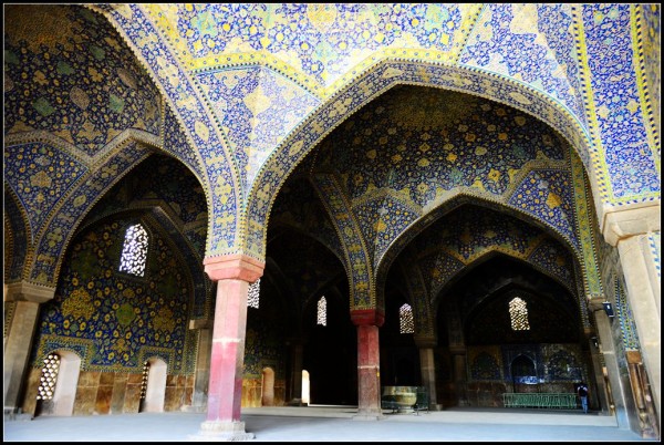 沙阿清真寺的南面主殿,要好好地欣赏美丽的穹顶,在深蓝色的背景下,以金色的玫瑰图案作为圆心,周围是密密麻麻的马赛克形成的同心圆,该建筑使用了双层天花板,内部天花板高36米,而外部天花板则高达51米。当站在穹顶正中央下方的地砖用力跺脚,能够听到响亮的回声,这是中空所产生的效应,一个人说话,整个清真寺都能听到。